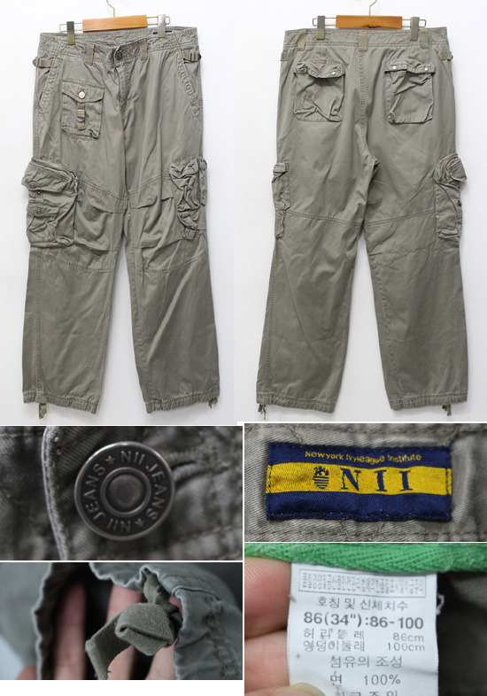 슬림한 일자라인의 빈티지 카키 카고바지입니다. 밑단 옆 지퍼랑 조임끈 있어