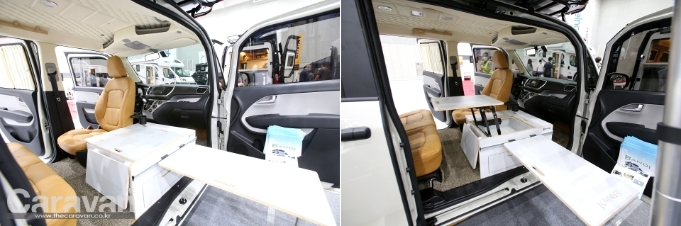 반디 3인승은 회전 시트와 평탄화 가구, 수납 박스 정도 간단한 구조에서부터 루프탑 텐트, 전기, 냉난방, 기타 옵션을 추가한 구조 등 캠핑 스타일에 맞게 커스터마이징이 가능한 모델이다. 좀 더 자세한 가격 및 상담, 렌트 등과 관련해서는 판매를 담당하는 한국상인으로 확인 바란다.