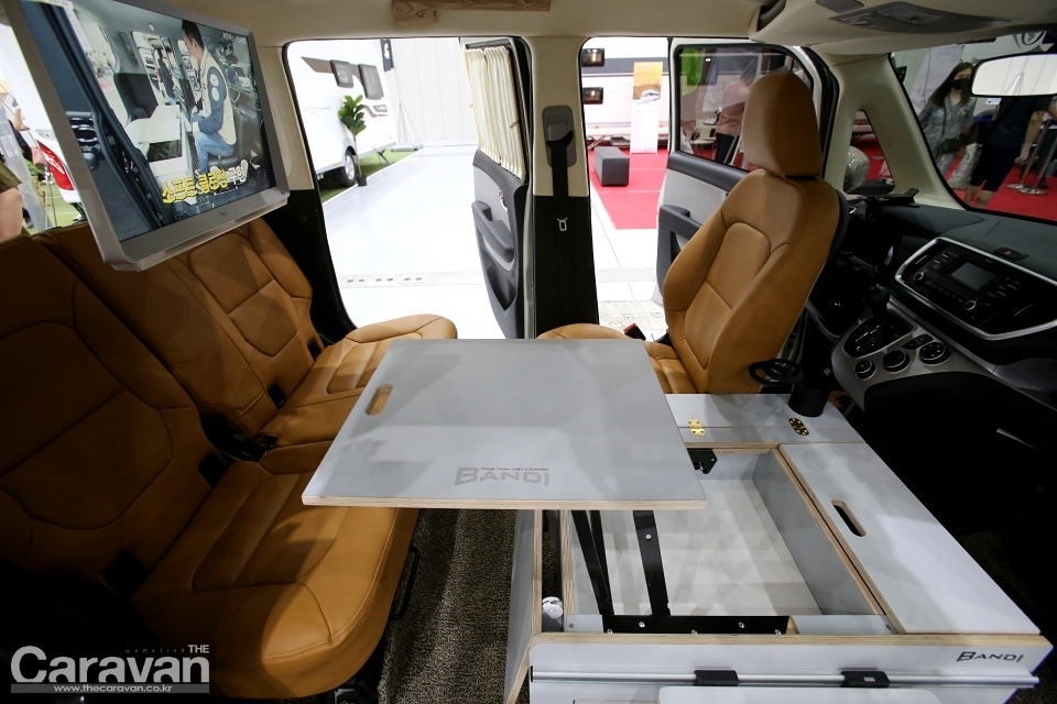 가장 눈에 뜨는 변화는 조수석 캠핑 박스와 루프탑 텐트다. 반디 3인승은 한정된 레이 공간을 3인에 맞게 늘리기 위해 과감하게 조수석을 제거하고 위로는 루프탑 텐트를 설치했다. 조수석 자리에는 캠핑 박스는 다용도로 활용이 가능하다. 평소에는 자주 사용하는 짐을 수납하거나 옆으로 테이블을 결합하면 야외로 확장하여 사용할 수 있다. 뒷좌석과 연결해 넓은 침상으로 쉽게 연장할 수 있고, 리프트업 테이블을 빼내 간단한 식사나 탁자로 쓸 수 있다. 생활에 불편함 없이 최대한 공간을 활용할 수 있게 제작되어 크게 자리를 차지하지 않고 다리를 펴거나 이동에 방해하지 않는다. 루프탑 텐트는 외부 사다리를 이용해 2인이 취침할 수 있는 공간을 제공한다.