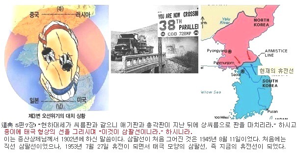 道典 5:7:3) “현하대세가 씨름판과 같으니 애기판과 총각판이 지난 뒤에 상씨름으로 판을 마치리라.” 하시고 종이에 태극 형상의 선을 그리시며 “이것이 삼팔선이니라.” 하시니라.