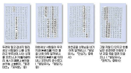 倒山移海海印用事(도산이해해인용사) 任意用之往來(임의용지왕래)하며 無爲理化自然(무위이화자연)으로 白髮老軀無用者(백발노구무용자)가 仙風道骨更少年(선풍도골갱소년)에 不老不衰永春化(불노불쇄영춘화) 病人骨髓不具者(병인골수불구자) 死者回春更生(사자회춘갱생)하니 不可思議海印(불가사의해인)일세