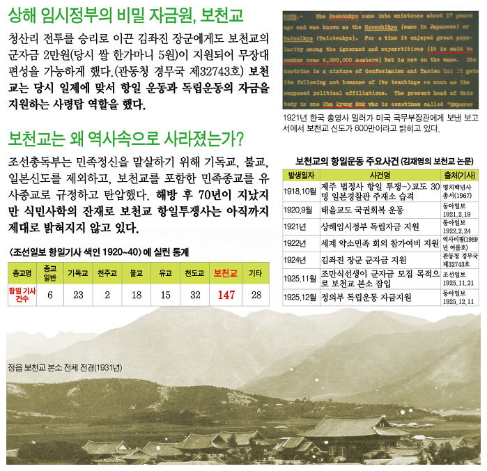 지난 조선 왕조가 망할 때 농민 동학군이 60만이 조직화됐는데, 그 가운데 30만이 조선 정부와 특수부대에 의해 참혹하게 죽었다. 동학군 60만이 패망당한 뒤 그 뒤를 계승해서 20세기 초엽에 항일운동과 독립운동 자금의 사령탑인 정읍 대흥리 보천교를 중심으로 약 700만 명이 일어났다.