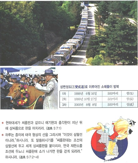 정주영회장은 같은 해 10월 27일 다시 한차례 더 501마리의 소떼를 몰고 휴전선을 넘었으며 다시 해를 바꾸어 2000년 8월 8일 그의 아들에 의해 세번째로 500마리의 소떼가 넘어감으로써 온 세계인의 가슴에 현대그룹의 이미지를 강하게 남겼다. 화둔(火遁) 공사를 준비하심(남북 핵전쟁 막는 공사) 道典 5편227장) 하루는 상제님께서 신경원의 집에 계실 때 성도들에게 말씀하시기를“천지에 변산처럼 커다란 불덩이가 있으니 그 불덩이가 나타나 구르면 너희들이 어떻게 살겠느냐.”하시며
