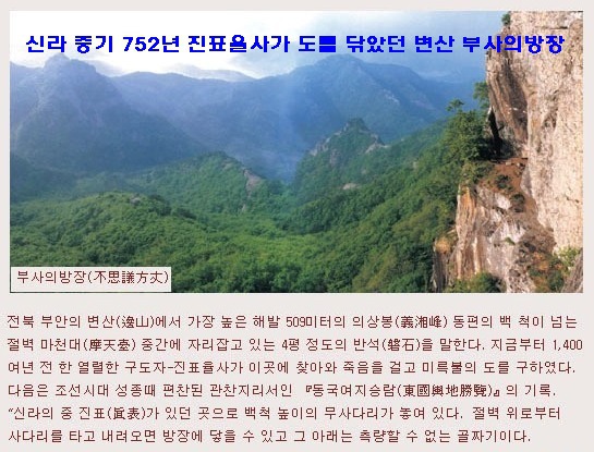 道典5편184장) 금강산 부처 기운을 거두심(북한 사회주의 국운공사) 상제님께서 순창 농바우에 계실 때 조선 국운 심판 공사를 마치시고 형렬에게 이르시기를 “허미수가 중수한 성천(成川) 강선루의 일만 이천 고물에는 녹(祿)줄이 붙어 있고 금강산 일만 이천 봉에는 겁살(劫煞)이 끼어 있나니 이제 그 겁살을 벗겨야 하리라.” 하시고
