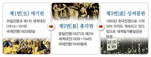 ※ 애기판씨름〈러일전쟁과 제1차 세계대전〉, 총각판씨름〈중일전쟁과 제2차 세계대전〉으로 전개되었다. 그리고 후반 50년에 들어서면서 인류사의 가장 큰 씨름이며 마지막 씨름인 제3차 세계대전, 상씨름의 전초전 6.25전쟁을 벌인 것이다.