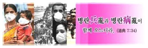 道典7편34장) “병란(兵亂)과 병란(病亂)이 함께 오느니라. 동서양 싸움을 붙여 기울어진 판을 바로잡으려 하였으나 워낙 짝이 틀려 겨루기 어려우므로 병(病)으로써 판을 고르게 되느니라. 또 말씀하시기를 “난은 병란(病亂)이 크니라. 병겁이 일어나면 두더지가 땅을 뒤지지 못하고 제비가 하늘을 날지 못하리라.” 하시니라. 상제님께서 말씀하시기를 “앞으로 무법(無法) 삼 년이 있다. 그 때는 사람들이 아무 집이나 들이닥쳐 같이 먹고살자고 달려들리니 내 것이라도 혼자 먹지 못하리라.” 하시니라.
