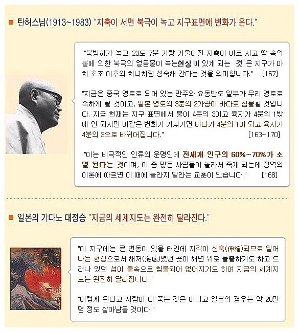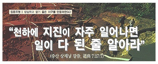 道典7편17장) 운수는 가까워 오고 도(道)는 멀리 가리니 마음을 굳게 가져 목 넘기기를 잘 하라. 부하고 귀하고 강권을 가진 자는 모든 척(隻)에 걸려 콩나물 뽑히듯 하리라. 지금은 원시반본(原始返本)하는 시대니 혈통줄을 바르게 하라. 환부역조(換父易祖)하는 자는 다 죽으리라. 대개벽의 전주곡 가마(釜)가 끓고 인후(咽喉)가 타고 창자(魚腹)가 썩으면 세상일을 가히 알리라. 고기는 꼬리(魚尾)가 병들면 힘을 못 써 죽느니라. 천하에 지진이 자주 일어나면 일이 다 된 줄 알아라. 실시간 전세계 지진 현황 : http://www.iris.edu/dms/seismon.htm 가마(釜)가 끓고: 6.25때의 부산(釜山)을 말한다. 道典11편264장) “앞으로 세상이 병란(病亂)으로 한번 뒤집어지느니라.” 하시고 “장차 이름 모를 온갖 병이 다 들어오는데, 병겁(病劫)이 돌기 전에 단독(丹毒)과 시두(時痘)가 먼저 들어오느니라. 道典 7편63장) 앞으로 시두(時痘)가 없다가 때가 되면 대발할 참이니 만일 시두가 대발하거든 병겁이 날 줄 알아라. 그 때가 되면 잘난 놈은 콩나물 뽑히듯 하리니 너희들은 마음을 순전히 하여 나의 때를 기다리라.” 하시니라.