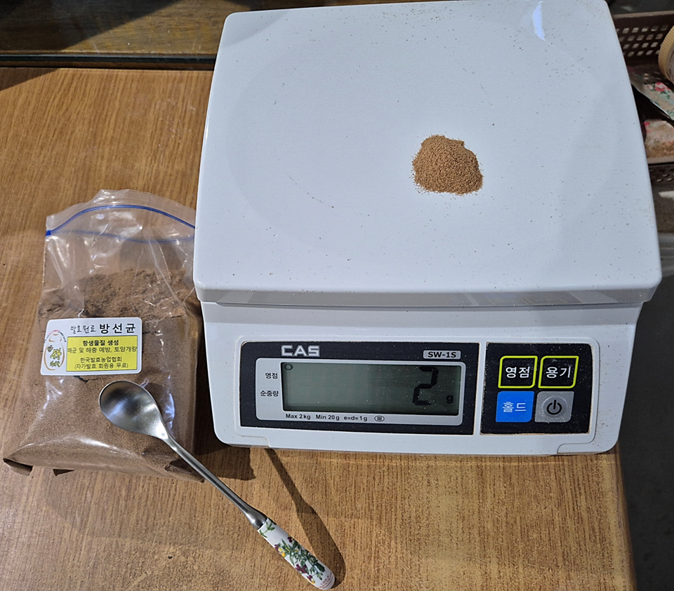 200리터 통에 방선균 350g + 방선균의 먹이인 갑갑류 껍질가루를 액비에 따라서 약 500g을 넣도록 하고 있습니다