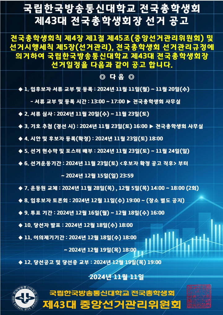 전국총학생회 제43대전국총학생회장선거공고 작성자이민숙(제42대 총학생회장)|작성시간24.11.11|조회수53 목록 댓글 0 글자크기 작게가 글자크기 크게가 다음검색 현재 게시글 추가 기능 열기 북마크 신고 센터로 신고 댓글 댓글 0 댓글쓰기 답글쓰기 댓글 리스트