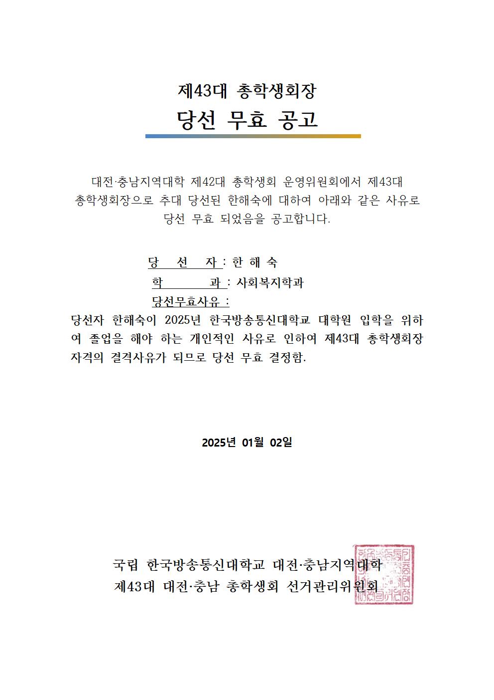제43대 총학생회장 당선무효 공고 작성자이민숙(제42대 총학생회장)|작성시간25.01.02|조회수94 목록 댓글 0 글자크기 작게가 글자크기 크게가 제43대 총학생회장이 아래와 같이 당선무효되었으므로 공고합니다. 다음검색 현재 게시글 추가 기능 열기 북마크 신고 센터로 신고 댓글 댓글 0 댓글쓰기 답글쓰기 댓글 리스트
