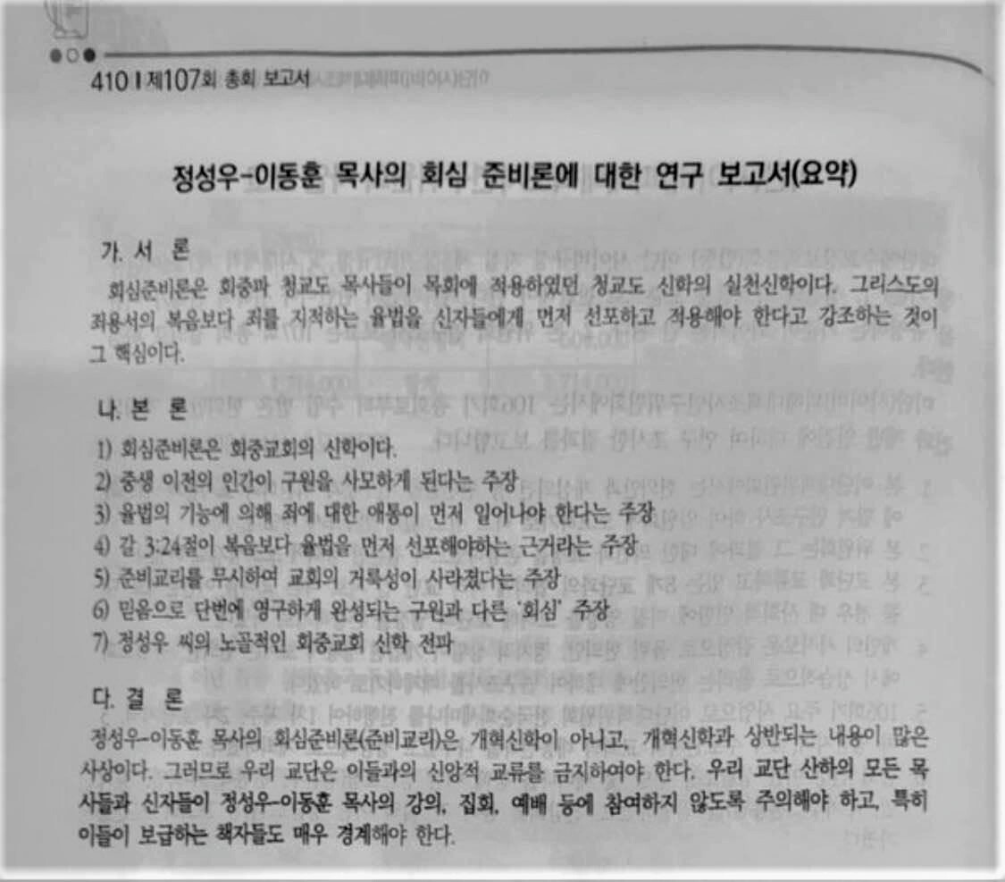 《정성우 이동훈 목사의 회심 준비론에 대해 참여 주의 및 경계 결의를 요청했다. 이대위는 “교단 산하의 모든 목사들과 신자들이 정성우-이동훈 목사의 강의, 집회, 예배 등에 참여하지 않도록 주의해야 하고, 특히 이들이 보급하는 책자들도 매우 경계해야 한다.”고 보고했다.》