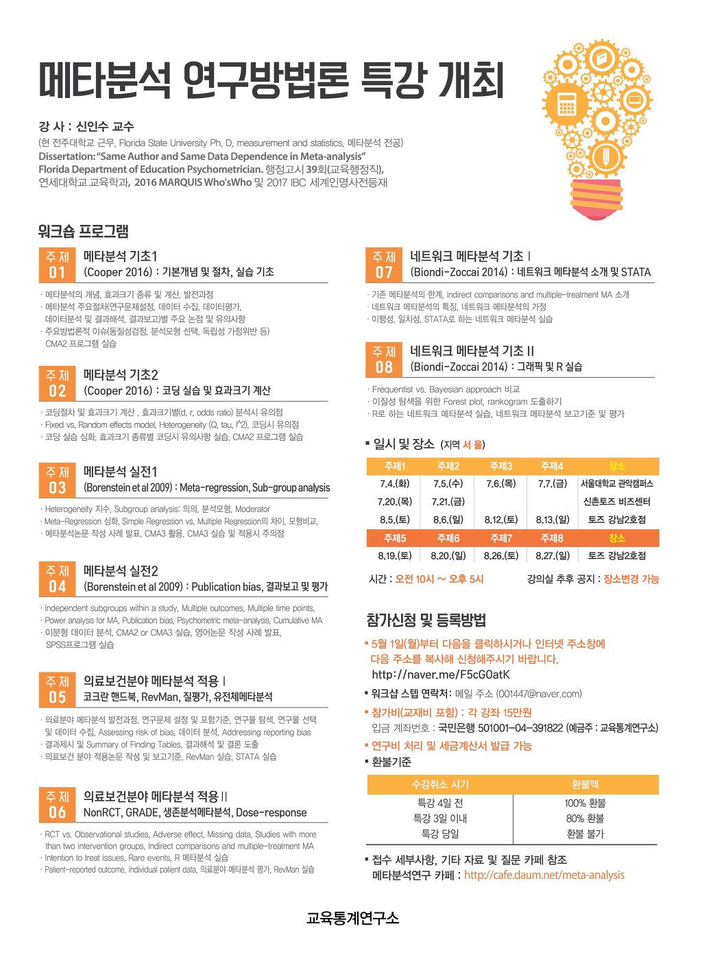 (2017년 7월-8월) 메타분석 특강 개최 안내 작성자happyjina|작성시간17.04.25|조회수445 목록 댓글 0 글자크기 작게가 글자크기 크게가 2017년 여름방학 메타분석 특강 계획.hwp특강 신청은 다음을 클릭하시거나 인터넷 주소창에 다음 주소를 복사해 신청해주시기 바랍니다.• http://naver.me/F5cGOatK 첨부파일첨부된 파일이 2개 있습니다. jpg 파일 포스터(메타분석).jpg 다운로드 hwp 파일 2017년 여름방학 메타분석 특강 계획.hwp 다운로드 다음검색 현재 게시글 추가 기능 열기 북마크 공유하기 신고 센터로 신고 댓글 댓글 0 댓글쓰기 답글쓰기 댓글 리스트