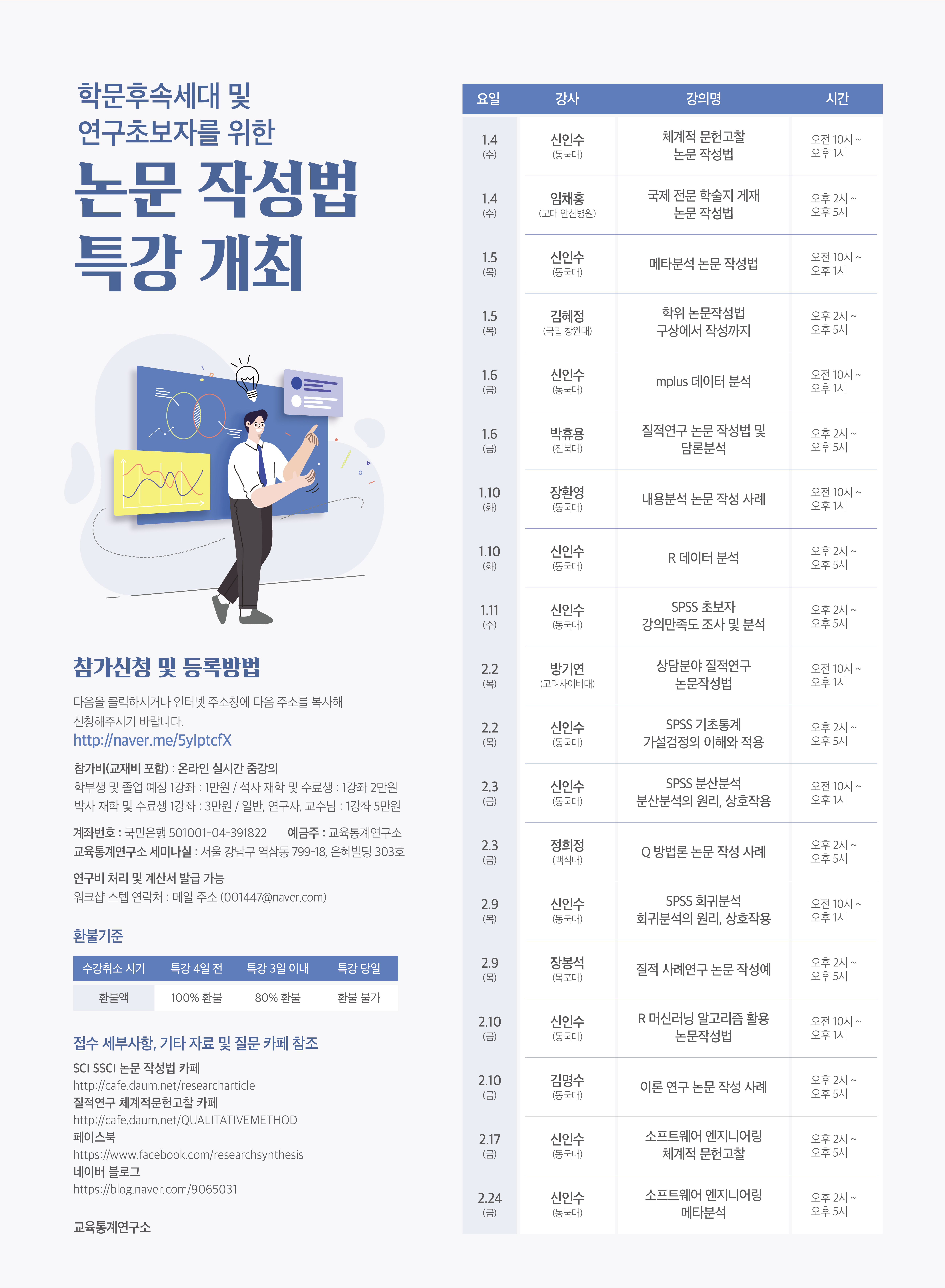 | 1.4.(수) | 오전10시~1시 | 체계적 문헌고찰 논문 작성법 | 신인수 (동국대) |