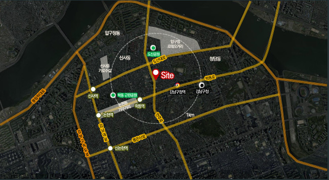 도산대로 및 학동역, 강남구청역, 강남구청 등 1km 이내 위치
