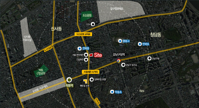 도산대로와 학동로 사이 위치하여 교통망 우수한 지역