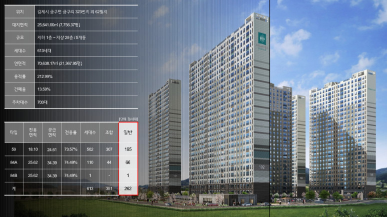 최고 28개층, 5개동, 총 613세대 중 일반분양 262세대