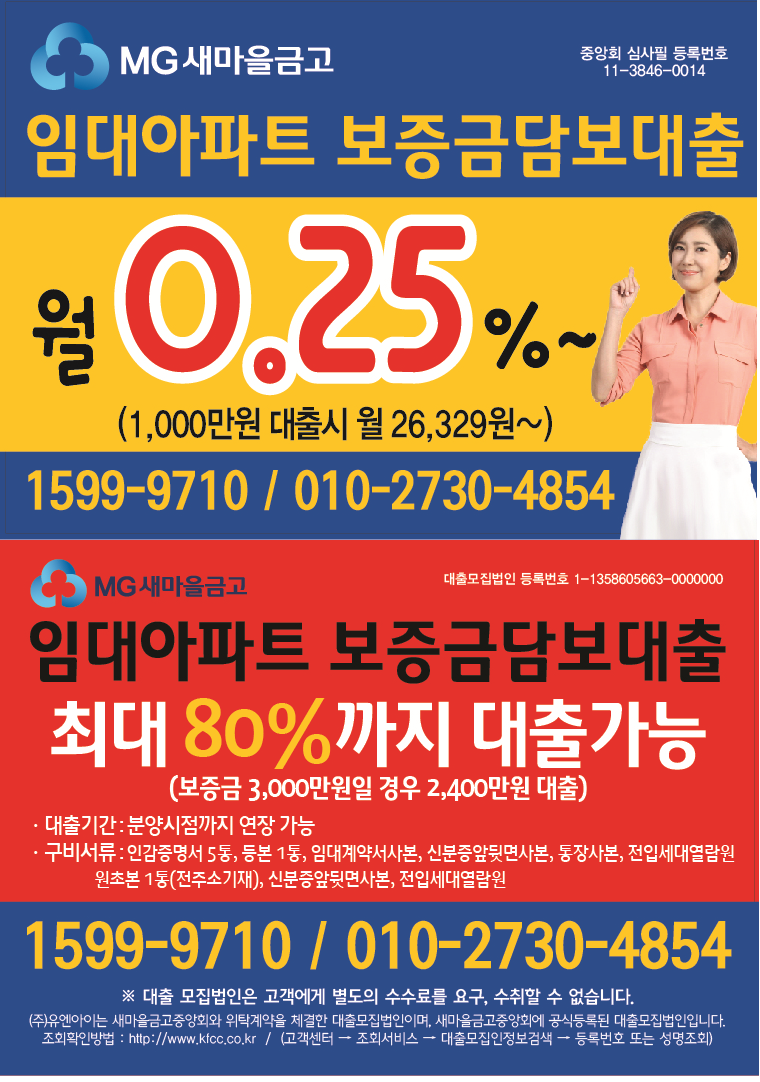 새마을금고 임대아파트 보증금 대출 최저금리!!! 작성자임대아파트 ^^|작성시간16.02.18|조회수23 목록 댓글 0 글자크기 작게가 글자크기 크게가 다음검색 현재 게시글 추가 기능 열기 북마크 공유하기 신고 센터로 신고 댓글 댓글 0 댓글쓰기 답글쓰기 댓글 리스트