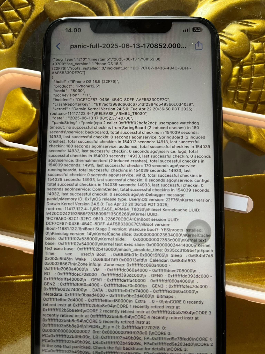 "panic-full"이라는 오류 메시지와 함께 긴 텍스트 로그가 표시된 상태를 보여줍니다. 이는 아이폰에 심각한 시스템 오류가 발생했음을 나타내는 커널 패닉(Kernel Panic) 증상입니다.