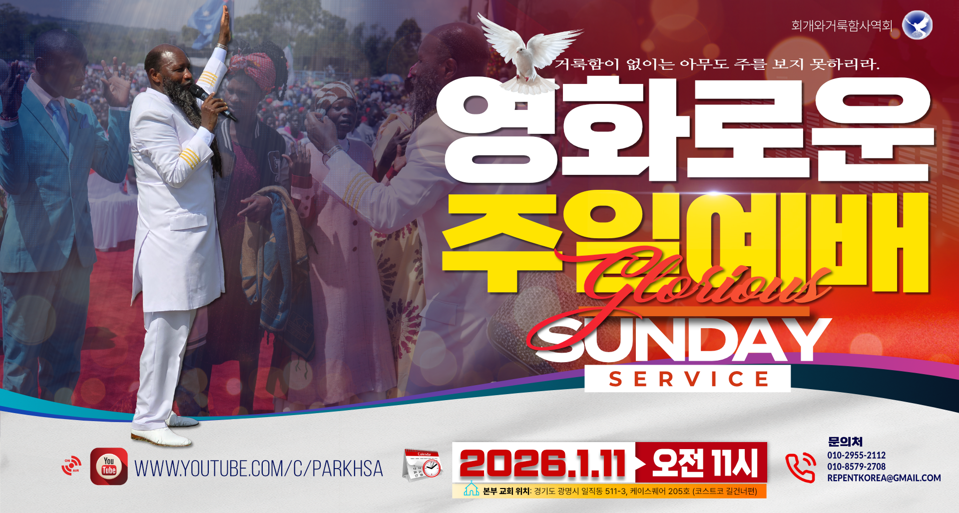 2026년 1월 11일 (오전 11시) 주일 예배 생중계 안내 작성자Arthur|작성시간26.01.11|조회수54 목록 댓글 1 글자크기 작게가 글자크기 크게가 유튜브 생중계 링크: www.youtube.com/c/parkhsa 다음검색 현재 게시글 추가 기능 열기 북마크 공유하기 신고 센터로 신고 댓글 댓글 1 댓글쓰기 답글쓰기 댓글 리스트 작성자김미화 | 작성시간 26.01.11 아멘 댓글 전체보기