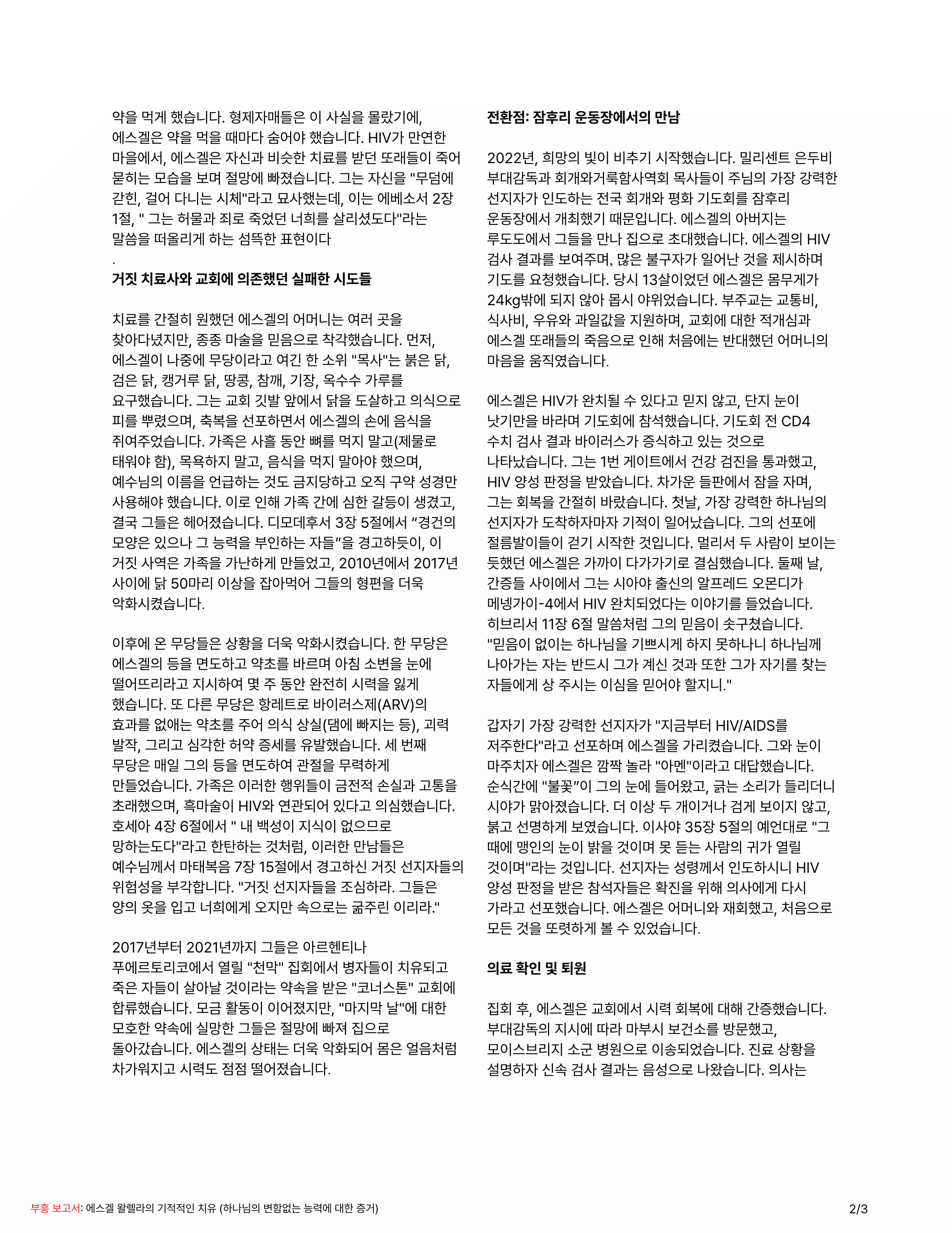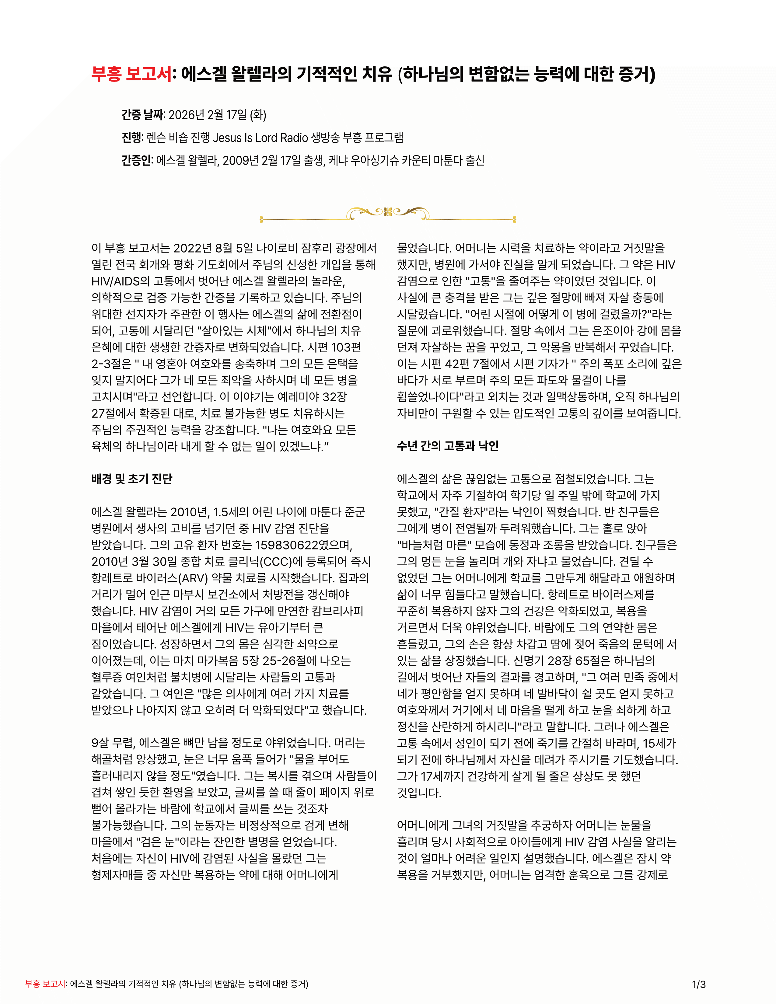 에스겔 왈렐라의 기적적인 HIV 에이즈 치유 (하나님의 변함없는 능력에 대한 증거) 작성자Arthur|작성시간26.02.18|조회수64 목록 댓글 0 글자크기 작게가 글자크기 크게가 에스겔 왈렐라 HIV 치유 간증 (20260218 Jesus is Lord 라디오 간증).pdf3.48MB 첨부파일첨부된 파일이 4개 있습니다. png 파일 에스겔 왈렐라 HIV 치유 간증 (20260218 Jesus is Lord 라디오 간증)_1.png 다운로드 png 파일 에스겔 왈렐라 HIV 치유 간증 (20260218 Jesus is Lord 라디오 간증)_2.png 다운로드 png 파일 에스겔 왈렐라 HIV 치유 간증 (20260218 Jesus is Lord 라디오 간증)_3.png 다운로드 pdf 파일 에스겔 왈렐라 HIV 치유 간증 (20260218 Jesus is Lord 라디오 간증).pdf 다운로드 다음검색 현재 게시글 추가 기능 열기 북마크 공유하기 신고 센터로 신고 댓글 댓글 0 댓글쓰기 답글쓰기 댓글 리스트