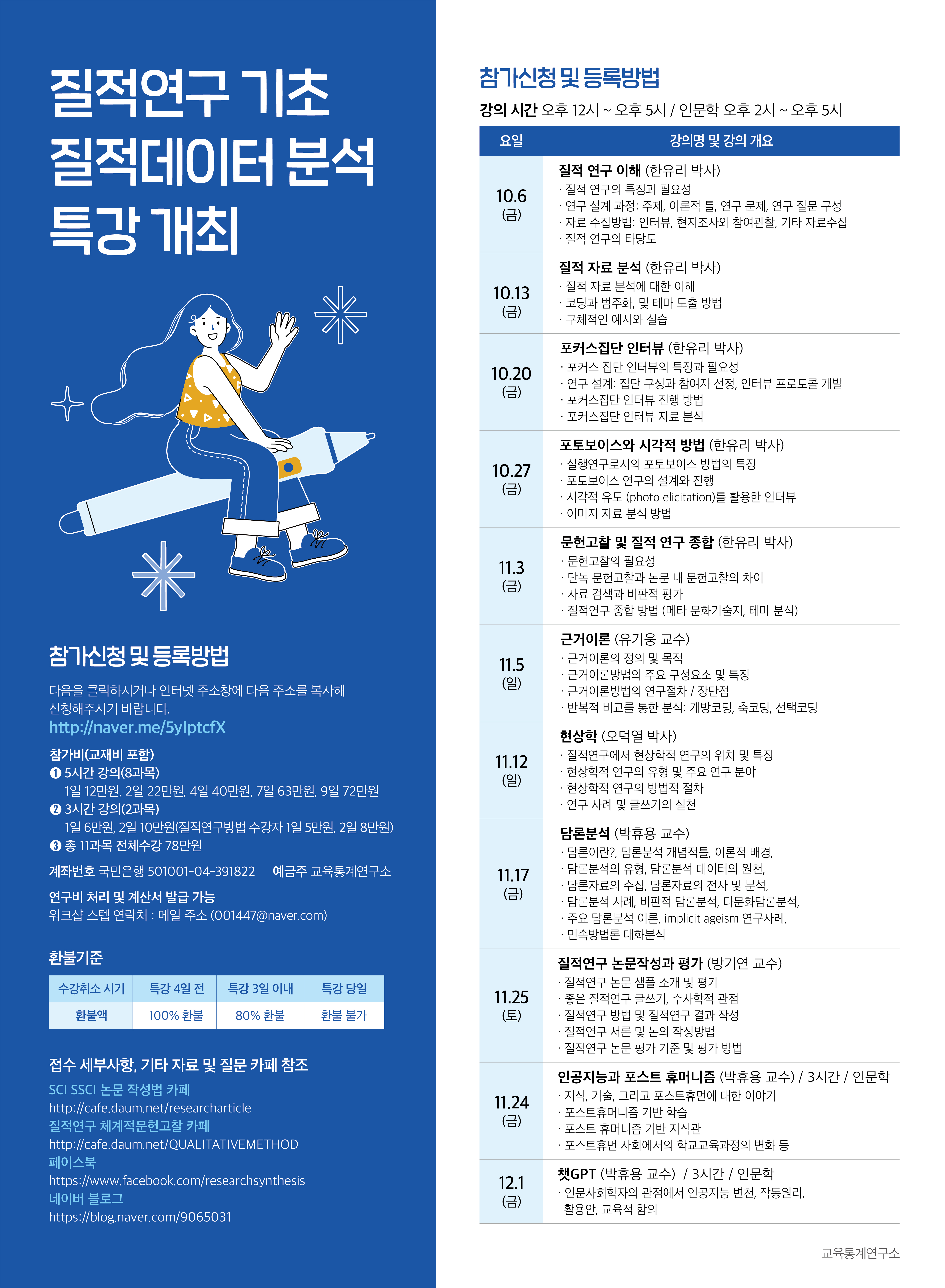- 3시간 강의 2과목: 온라인 1일: 6만원, 2일 10만원 (질적연구방법 수강자 1일: 5만원, 2일: 8만원)