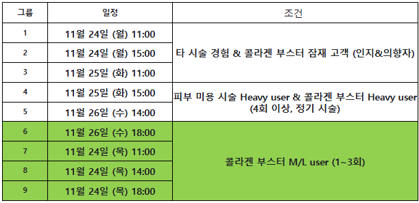 | [추가 기재사항] 최근 2년 이내 피부관리 시술명 및 횟수 / 원하는 그룹 예시) 콜라겐부스터(쥬베룩 볼륨 3회, 스컬트라 2회) / 콜라겐부스터 유저그룹 인모드 4회, 레이저토닝 10회 / 타시술 경험 콜라겐부스터 잠재고객 |