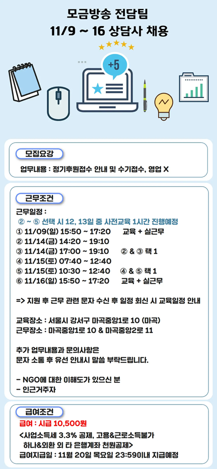 | 모금방송 전달팀 상담사 채용 – 11/9~16일 저희는 전화로 직접 모집하거나 안내드리지 않습니다. 공식 모집은 홈페이지와 네이버/다음 카페를 통해서만 진행됩니다. 전화, 문자나 링크를 통한 개별 연락은 모두 무관하오니 주의 부탁드립니다. 1. 대상 : NGO 이해도 있는 인근 거주자 2. 일정 : ① 11/09(토) 15:50~17:20 교육+실근무 ② 11/14(목) 14:20~19:10 ③ 11/14(목) 17:00~19:10 ④ 11/15(금) 14:20~19:10 교육+실근무 ⑤ 11/16(토) 15:00~17:10 교육+실근무 (⑤ 선택 시 12·13일 중 사전교육 1시간 예정) 3. 방법 : 정기후원 접수 안내 및 수기접수 (영업 없음) 4. 소요시간 : 회차별 1시간~5시간 내외 5. 사례비 : 시급 10,500원 (3.3% 공제) 6. 장소 : 서울 강서구 마곡중앙로 10·11 은행명 및 계좌번호(급여지급용) 추후 제출 요청 예정 |