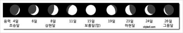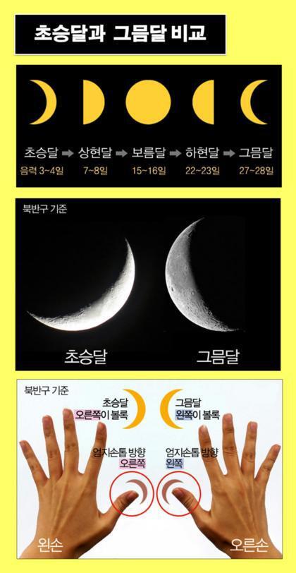 | 하얀 눈썹처럼(깨진 얼음 조각 같은) 보이는 달에 관한 궁금한 것을 알아봅니다. 달을 기준으로 생긴 태음력은 태양력에 밀려 요즘 달력에는 간단하게 표시되지만, 민속 최대 명절인 설날과 추석을 비롯하여 정월대보름, 석탄일, 단오 등은 모두 음력을 기준으로 합니다. 어촌에서는 음력이 절대적으로 필요합니다. 달을 보면 얇은 눈썹 모양을 한 초승달과 그믐달은 헷갈리는데 어떻게 구분할까? ▶ 태양처럼 매일 같지 않고 날마다 바뀌는 이유 달에 비치는 태양빛 각도, 지구에서 달을 보는 각도, 달 위치 등에 따라 지구 주위를 도는 달그림자가 달라지기 때문이며, 달은 서쪽에서 동쪽으로 위치를 옮겨가며 차고 이지러지는데, 그 모습에 따라 초승달(음력 3~4일경), 반달(상현), 보름달, 반달(하현), 그믐달(음력 27~28일) 등으로 달리 불립니다. ▼보름에서 다음달 보름까지 ▶ 구분법 ① 초승달과 그믐달을 구분하는 가장 쉬운 방법은 달의 삭망(朔望) 주기를 한 달 기준(29.5일)으로 삼고 있는 음력 날짜를 확인하는 것입니다. 달은 달 모습이 보이지 않는 삭(朔,음력 초하루, 태양과 지구 사이에 달이 위치함)으로 시작해 상현달-보름달-하현달-그믐달 순으로 모습을 바꿉니다. 초승달은 음력 3~4일경 뜨는 눈썹 모양 달이며 그믐달은 음력 27~28일 즈음에 볼 수 있습니다. 서양에서는 초승달을 새달이라고 해서 New Moon, 그믐달을 오래된 달이라 Old Moon이라고 부릅니다. ②초승달과 그믐달은 달이 뜨는 시간으로도 알 수 있습니다. 아침에 떠서 저녁에 서쪽으로 지는 초승달은 초저녁 서쪽 하늘에 낮게 떠 있다가 사라지며, 새벽녘에 뜨는 그믐달은 해가 뜨기 직전 동쪽 하늘에 잠깐 나타났다 날이 밝으면 금방 시야에서 사라집니다. ③초승달과 그믐달은 손톱 모양을 이용해 구분하기도 하는데 손을 손등이 눈앞으로 향하게 해서 볼 때 달 모습이 왼손 엄지손톱같이 오른쪽으로 보이면 초승달, 오른손 엄지손톱같이 왼쪽으로 보이면 그믐달이라는 것으로 이 방법은 우리나라와 같이 지구 북반구에서만 적용합니다. 로딩중 입니다. |