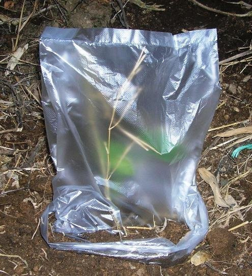 비닐 봉투가 날리지 않게 지면에 흙을 드믈게 흩어 뿌린다.