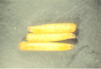 유충은 어릴 때는 백색이나 자라면서 황색을 띄며, 다 자란 유충은 길이가 11~13㎜ 정도의