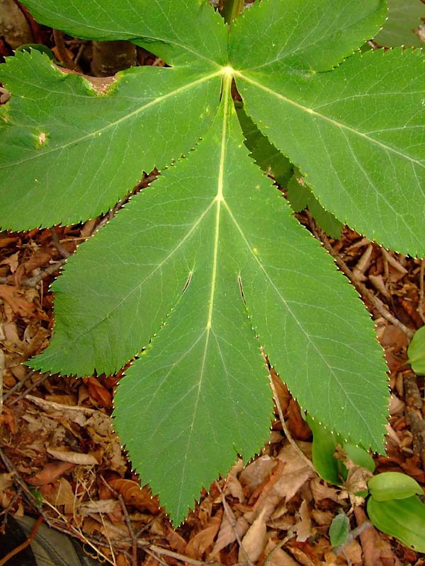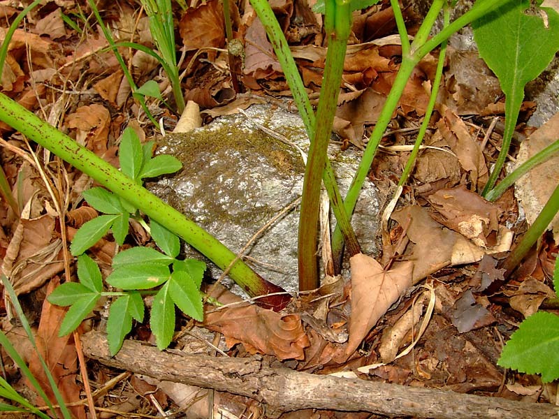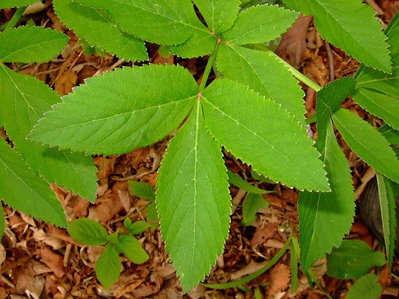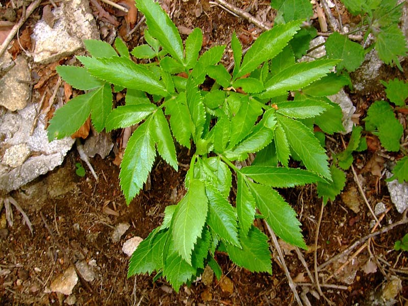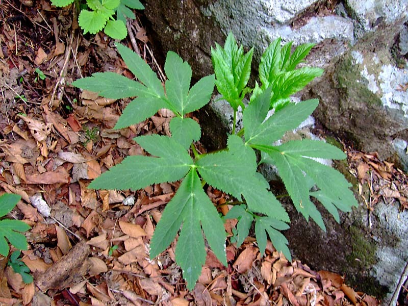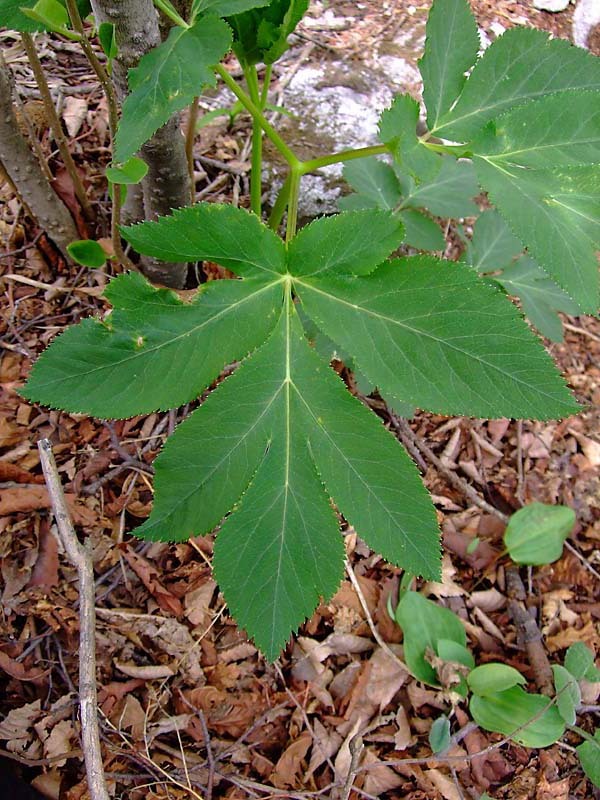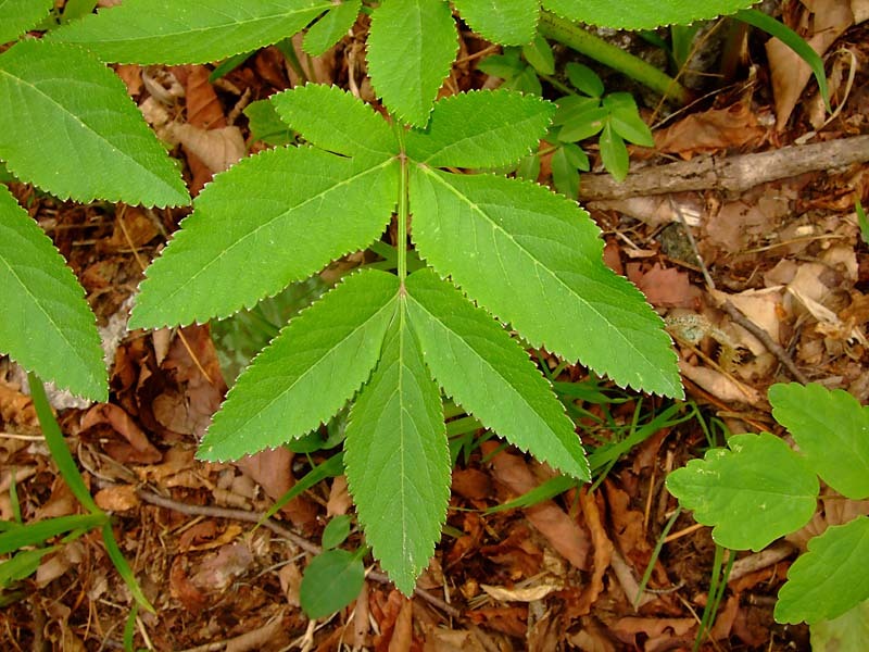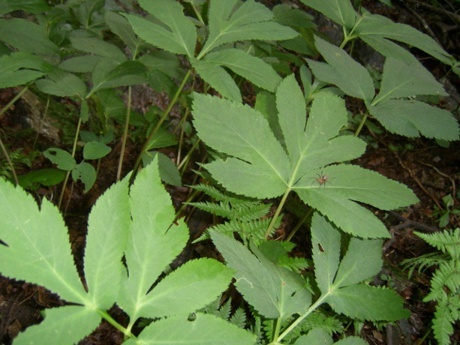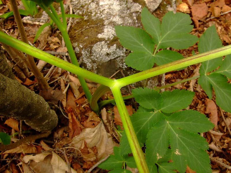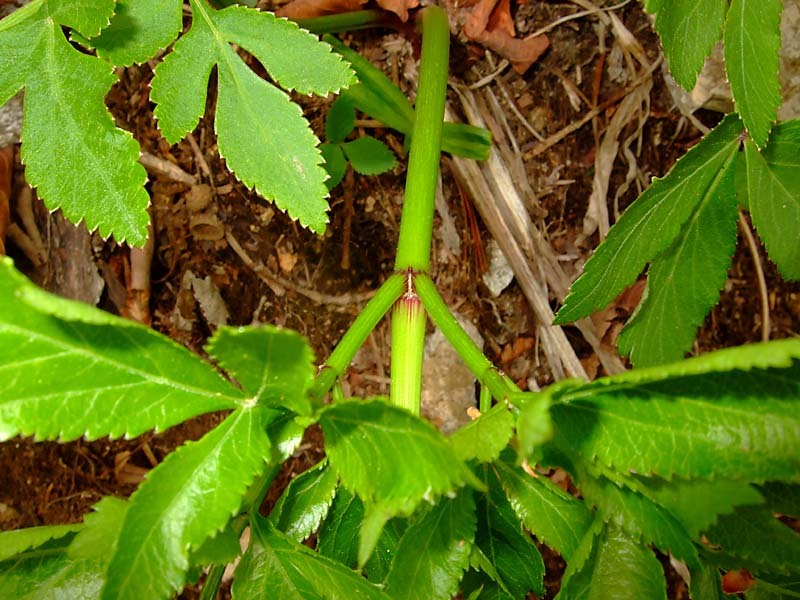 지리강활(개당귀)의 잎(아래로 뻗은 3개의 잎이 떨어져 있음)