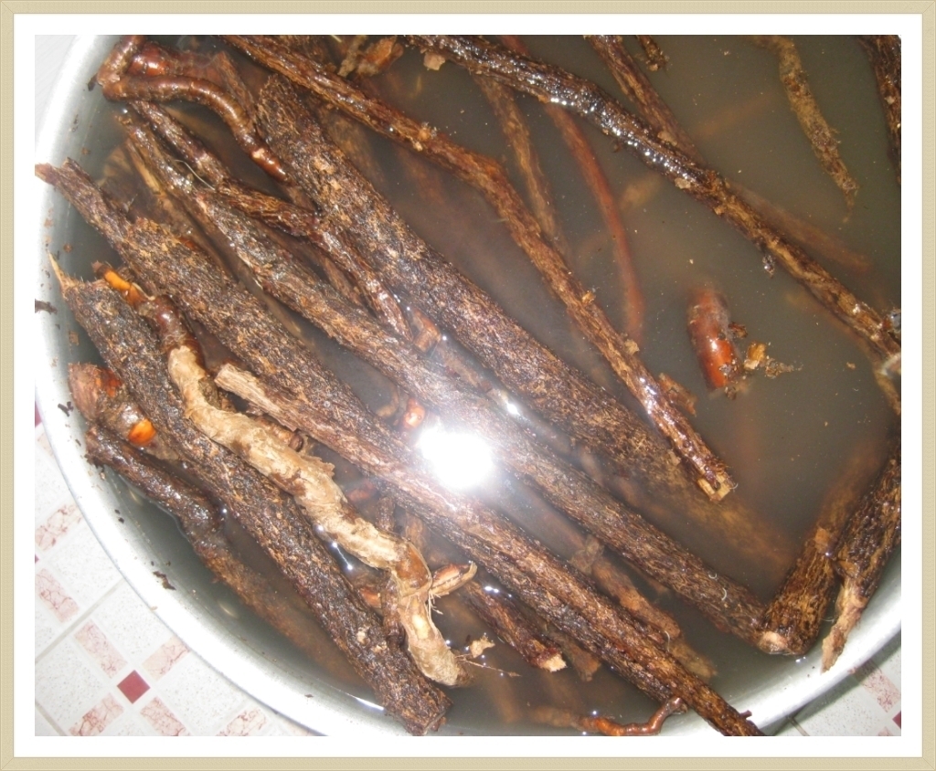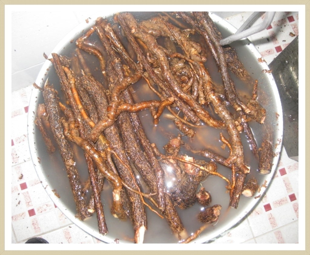 코르크층을 제거한 개머루 뿌리 껍질, 고삼과 산뽕나무뿌리껍질을 짓찧어, 주조(酒糟: 술지게미) 또는 황주(黃酒)를 섞어 병상(餠狀)으로 하여, 불로 가열해서 환부에 바른다. [절강천목산약식지]