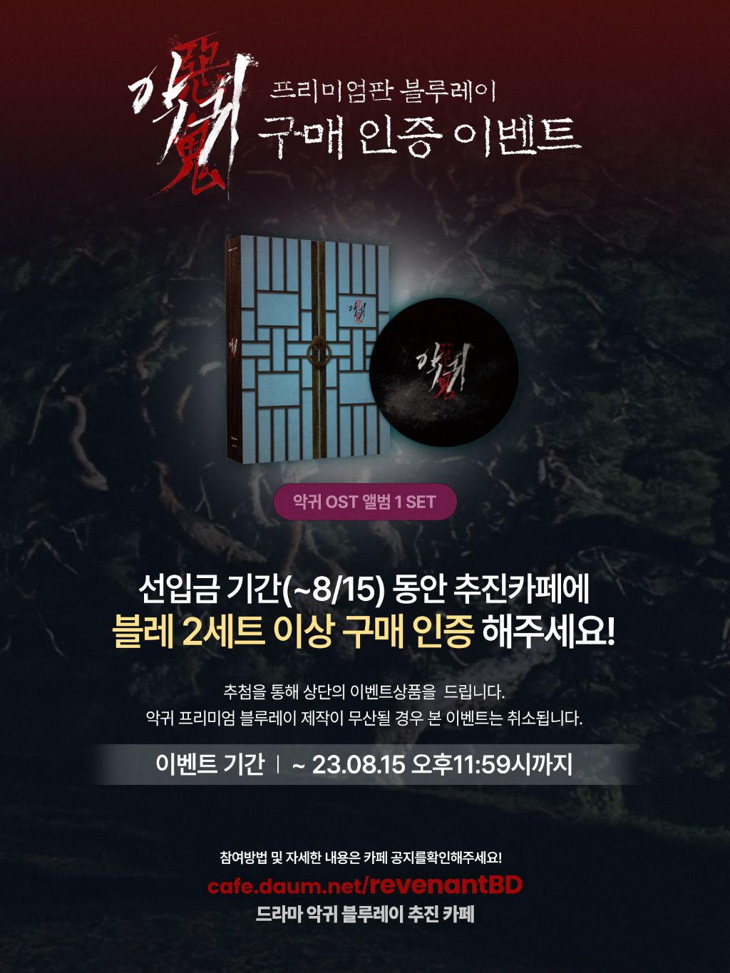 선입금 기간 동안(~8/15) 악귀 프리미엄판 블루레이를 2세트 이상 구매하신 회원분들 중 추첨을 통해 두 분께 악귀 OST CD를 보내드립니다.