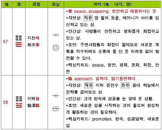 위는 땅[地]이고, 아래는 하늘[天]이다. 태(泰)는 ‘크다’. ‘크게 통한다’. ‘태평하다’라는 뜻이다. 땅의 기운은 하늘로 올라가고 하늘의 기운은 땅으로 내려와 서로 조화를 이룬다. 서로 크게 통한다는 의미로 태(泰)를 괘 이름으로 하였다.