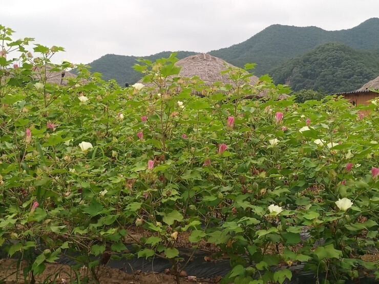 마을을 빙 둘러 보다가 오랜만에 이불 등을 만들었던 목화꽃을 만났습니다.