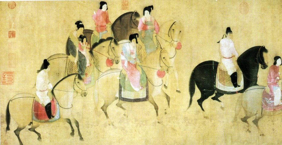 장훤(張萱:714-742활동)이 그린 <괵국부인유춘도(?國夫人游春圖)>는 양귀비의 셋째 언니 괵국부인이 봄나들이를 가는 장면을 묘사했다. 비록 송나라 휘종황제의 모사본이긴 하지만 화려하고 사치스런 당대의 마차의장행렬을 비교적 정확하게 전해준다. 그림 속에서 괵국부인은 ‘미인이 손수 옥화총의 고삐 잡으니/날래기는 놀란 제비가 나는 용을 탄 듯하고’ 현종이 있는 경광궁에 들어가려 ‘금채찍으로 길을 다투니’ ‘보물 비녀가 떨어졌다’는 싯귀절이 생생하게 느껴진다.(소식(蘇軾),「괵국부인야유도」중에서)