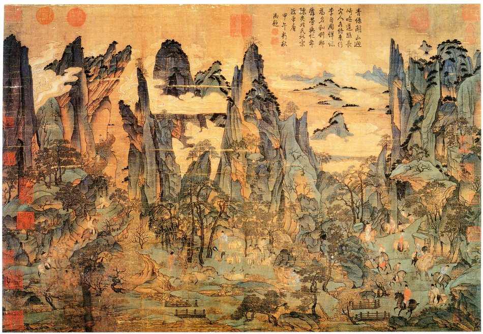 그런 어느 날 안녹산(安祿山:705?~757)이 반란을 일으켰다는 소식이 들려왔다. 양귀비와 가까이하며 권력을 차지하고 있던 안녹산이 궁중 내에서 자신을 후원했던 재상 이임보가 죽고 양국충과의 대결에서 밀리게 되자 무력도발을 감행한 것이다. 그는 군사를 일으킨 지 얼마 되지 않아 여러 성(省)들을 거침없이 무너뜨렸고 756년 여름에는 장안으로 진격해 들어왔다. 위험에 빠진 현종은 양국충 가문의 세력 기반인 쓰촨(四川)으로 피난을 떠났다. 당나라 때 활동한 이소도(李昭道:약 675-741)의 작품으로 전해지는 <명황행촉도(明皇幸蜀圖)>는 명황(明皇은 현종의 시호)이 촉나라로 피난 가는 모습을 그렸다. 험악한 산세를 보여주듯 거대한 산봉우리가 구름에 걸렸다. 구불구불한 길을 말을 탄 피난민들이 걸어가고 있다. 이소도는 아버지 이사훈(李思訓:651-716)의 뒤를 이은 청록산수화(靑綠山水畵)의 대가답게 산과 바위를 불투명한 채색으로 장식했다. 그런데 장식적인 경향이 두드러지다 보니 피난민을 그린 것인 지 아니면 유람하는 사람을 그린 것인 지 분간하기 힘들 정도로 현실감이 떨어진다. 바게트빵처럼 부풀어 오른 산봉우리와 피난민들이 입고 있는 현란한 색채가 어우러져 그림은 더욱 장식적이고 화려하다.