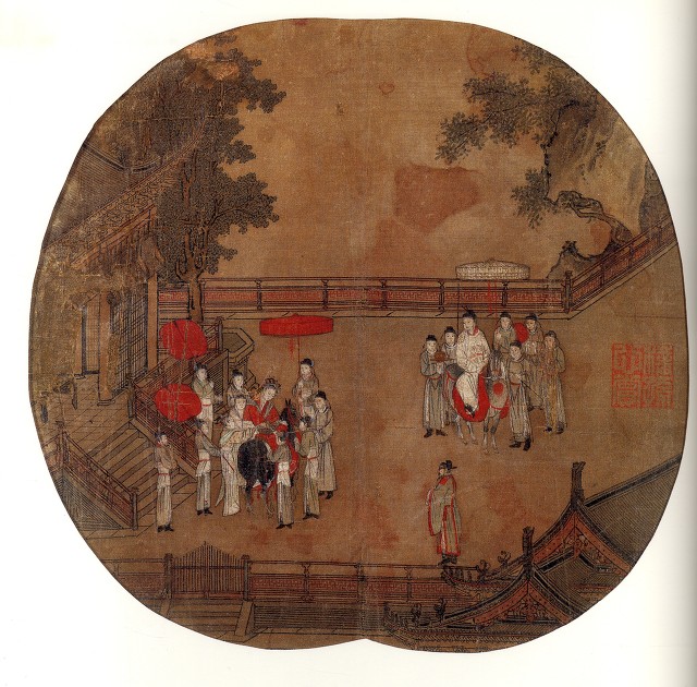 작자미상, <귀비가 말에 오르다(귀비상마도)>, 둥근 부채, 비단에 색, 남송, 25×26.3cm, 미국 보스턴미술관: 여러 사람의 부축을 받으며 양귀비가 황궁으로 떠나기 위해 말에 오르고 있다. 그런 양귀비를 현종이 사랑스런 눈길로 바라보고 있다.