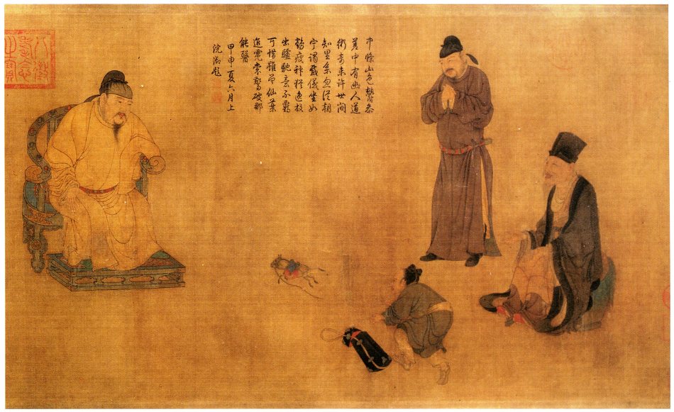 임인발, <장과견명황도>(부분), 두루마리,원, 41.5×107.3cm, 북경 고궁박물원:장과는 흰 종이 나귀를 거꾸로 타고 하루에도 수백 리를 갈 수 있었다. 쉴 때에는 나귀를 곱게 접어 종이처럼 얇은 상자 속에 넣어두었다가 필요하면 물을 뿌려 나귀를 일으켜 세워 타고 갔다고 한다. 오른쪽에 앉은 늙은 도사가 도술을 부리자 어린 소년이 나귀를 풀어준다. 노새가 황제를 향해 달려가자 현종이 신기한 듯 바라보고 있고 옆에 선 대신은 박수를 치며 즐거워하고 있다.