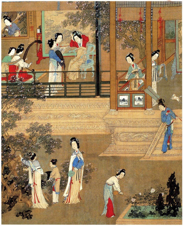 구영, <인물고사도>, 책, 명, 41.1×33.8cm, 북경 고궁박물원:황금으로 꾸민 궁전에서 양귀비가 곱게 화장을 하고 있다. 구영은 화려한 색채와 섬세한 묘사로 당나라 궁실의 현장을 생생하게 복원했다.