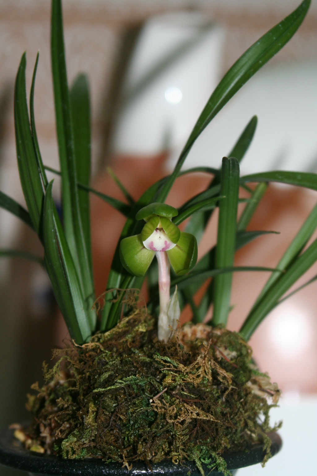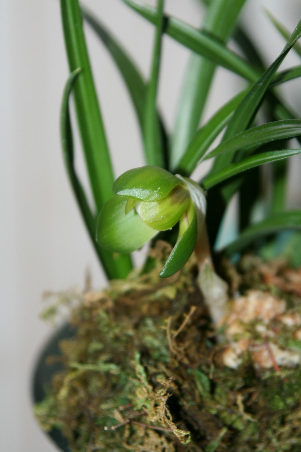 신아 두촉을 올리고 가을에 꽃대 한대가 달렸는데...... 몽우리의 모습이 영~~ 시원찮은 원판화 정도의 모습이라 실망하고 꽃들이 모여있는 한쪽 모퉁이에 수태만 둘러 주고 놓아 두었더니 항명이라도 하는 듯 일주일 만에 난실에 물주러 와서보니 멋지게 개화 하였습니다.