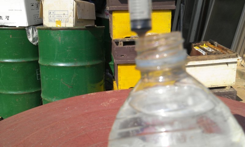 프라스틱 제품 약한것은 녹아내려 벌통안의 벌을 전멸 시킬수가 있으니 꼭 유리병으로 합니다.