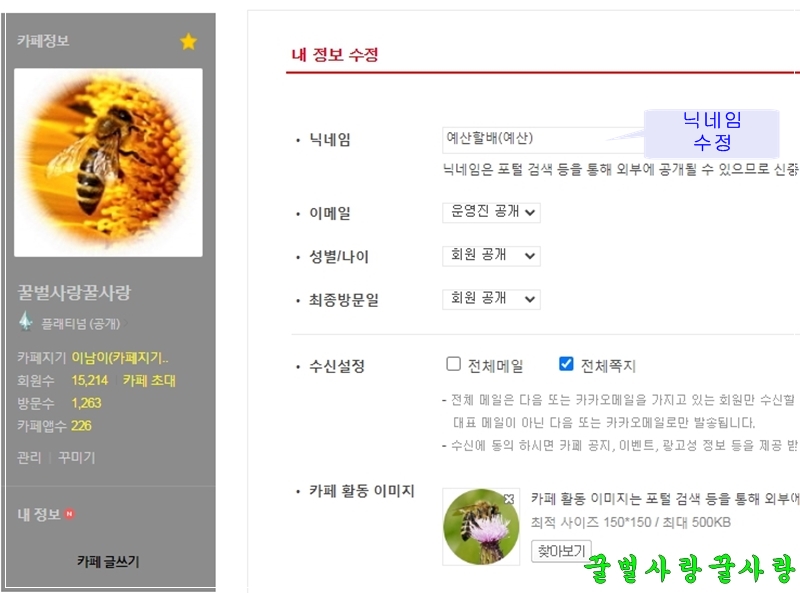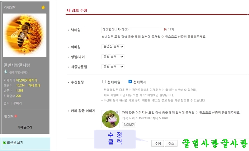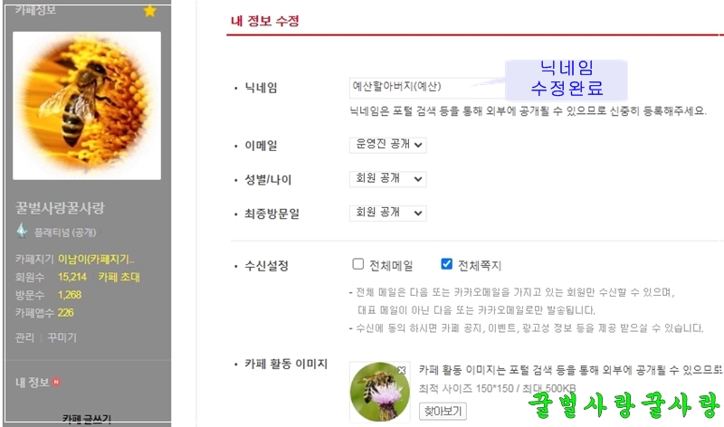 3. 내정보 수정에서 닉네임을 수정 합니다. 지역명 표시는 필수 입니다.