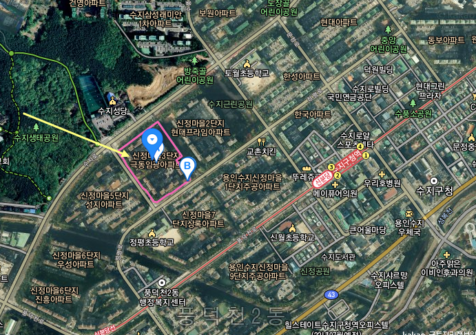 | 교통 | ㆍ풍덕천2동 주차장(360m)ㆍ신봉동 주차장(493m)ㆍ수지노외공영주차장(528m)ㆍ수지로얄스포츠센터 주차장(562m)ㆍ수지도서관 주차장(597m)ㆍ신정공원 주차장(597m)ㆍ하나로프라자 주차장(651m)ㆍ용인시평생학습관 공영주차장(671m)ㆍ아마노코리아 용인경방프라자점(677m)ㆍ풍덕천셀프주유소(710m) |