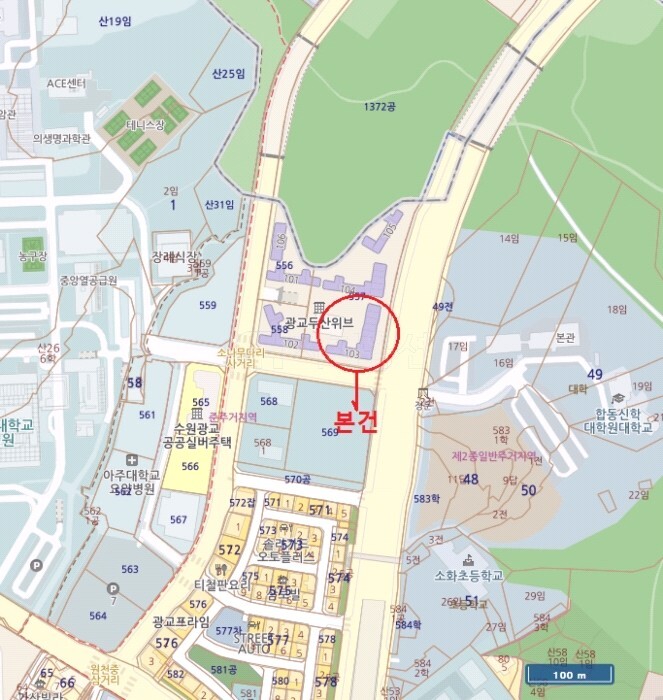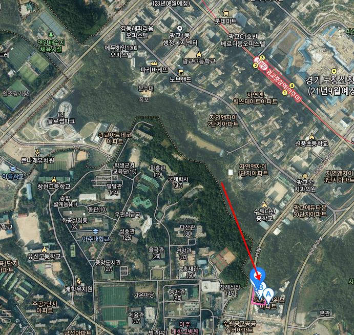 | 생활 | ㆍ광교두산사랑공인중개사사무소(70m)ㆍ두산위브부동산(91m)ㆍ추오정남원추어탕 광교점(266m)ㆍ티철판요리전문점(311m)ㆍ아주대학교 도구박물관(341m)ㆍ광교파트너공인중개사사무소(467m)ㆍ아주대학교 노천극장(469m)ㆍ아주대학교 소극장(528m)ㆍ금호부동산공인중개사사무소(542m)ㆍ듀쿠플(547m) |
