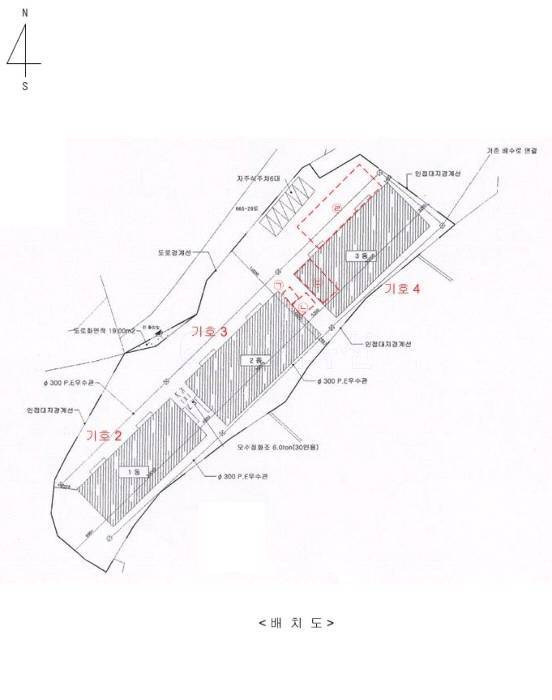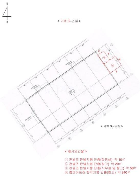 | ㆍ입찰외 ㆍ 1. 일괄매각. ㆍ2. 제시외건물로 판넬조 판넬지붕 단층 화장실 약 10㎡(부동산의 표시 중 3.건물 측면), 판넬조 판넬지붕 단층 창고 약 20㎡(3.건물 측면), 판넬조 판넬지붕 단층 사무실 및 창고 약 50㎡(4.건물 내), 철파이프조 천막지붕 단층 창고 약 240㎡(4.건물 측면) ㆍ이 소재하나 감정인의 탐문조사에 따르면 임차인이 설치한 것으로 보인다고 하므로(감정평가서 참조) 매각에서 제외함 ㆍ3. 본건 토지 지상에 컨테이너박스 수개동이 소재하나 임차인이 자신의 소유라고 주장하고 있고 또한 이동 및 철거가 용이하므로 평가 및 매각에서 제외함 ㆍ4. 부동산의 표시 중 5.토지는 2,3,4.건물의 출입을 위한 진입로로 사용중임 |