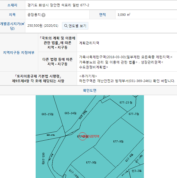 | 경기 화성시 장안면 석포리 677-2 2동 감정평가액 건물:260,820,000 *일반철골구조기타지붕 | 건물 ㆍ공장420(127.05평) 260,820,000원 - 승인:2013.04.25 | | 경기 화성시 장안면 석포리 677-2 3동 감정평가액 건물:260,820,000 *일반철골구조기타지붕 | 건물 ㆍ공장420(127.05평) 260,820,000원 - 승인:2013.04.25 | | 경기 화성시 장안면 석포리 677-22 감정평가액 토지:2,964,000 *계획관리지역 *가축사육제한구역(2018.03.30)(일부제한모든축종제한지역) *성장관리권역 *표준지가 : 239,500 *개별지가 : 79,000 *감정지가 : 156,000 | 도로 19(5.75평) 2,964,000원 건물출입위한진입로 - 승인:2013.04.25 | |