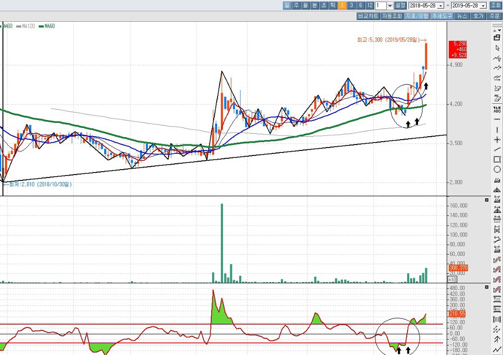 - 이평선들이 이격을 좁히면서 추세를 무너트리지 않으며, 5일선이 60일선을 터치하는 형국에서 매수 시점을 잡음