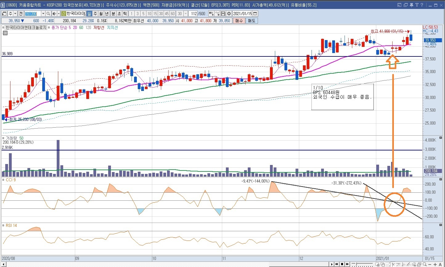1/8 대표님 공부종목. cci9에 추세선을 그어보니 하락추세선을 돌파하는 지점. 외국인의 수급이 매우 좋음.