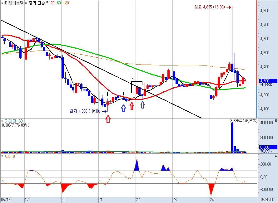 - 첫번째 빨간 화살표에서 5일선 올라탄후 7봉후에 다시 5일선 아래로 내려오면 1바닥